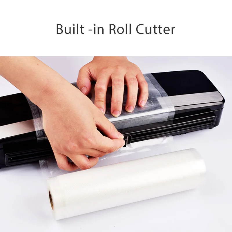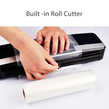 Tässä vakuumikoneessa on näppärä, magneetilla kiinnittyvä pussinleikkaaja(Huom, valitse se sivuilta, Bundle 2)). Sen avulla pussista on helppo leikata sopivan kokoinen pala, niin että sauma on aina suora.